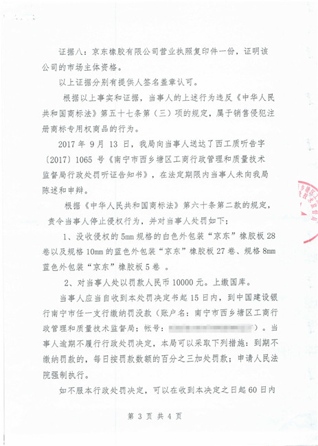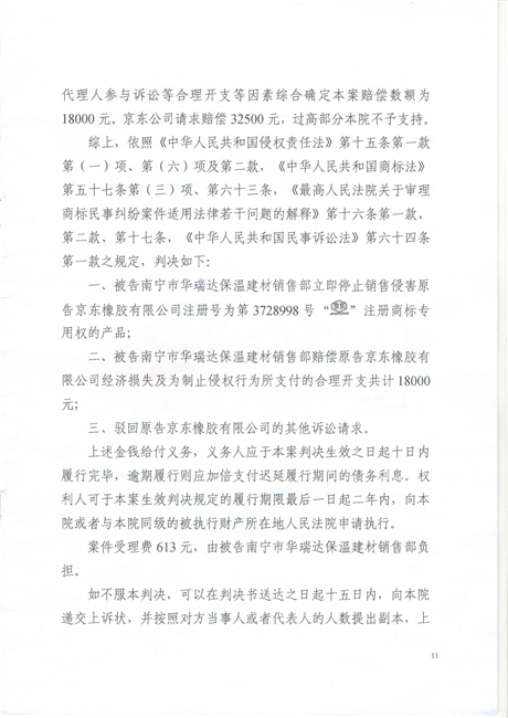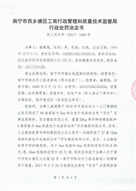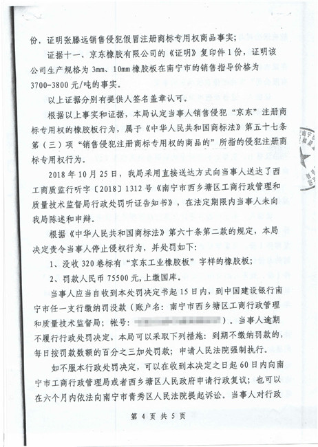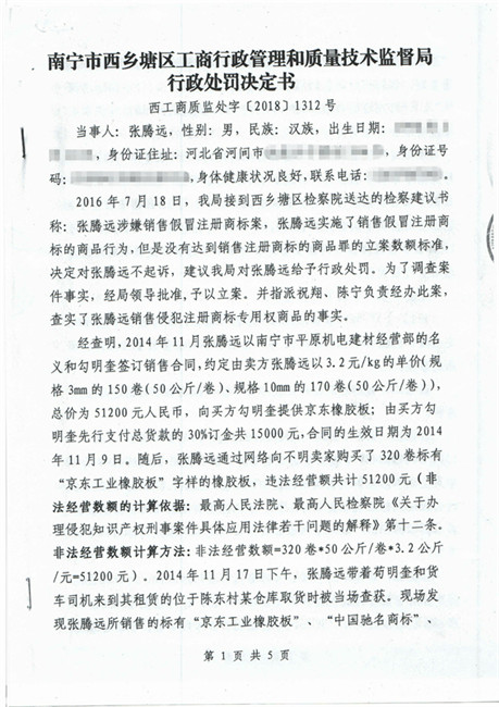 截止到2018年11月份,廣西南寧西鄉(xiāng)塘區(qū)工商行政管理和質(zhì)量技術(shù)監(jiān)督局對假冒我公司商標侵權(quán)行為進行行政處罰:崔建強[西工質(zhì)處字(2017)1065號] 10000元;張騰遠[西工商質(zhì)監(jiān)處字(2018)1312號] 75500元。全部上繳國庫。并對這兩起案件我公司也進行了司法賠償判決。